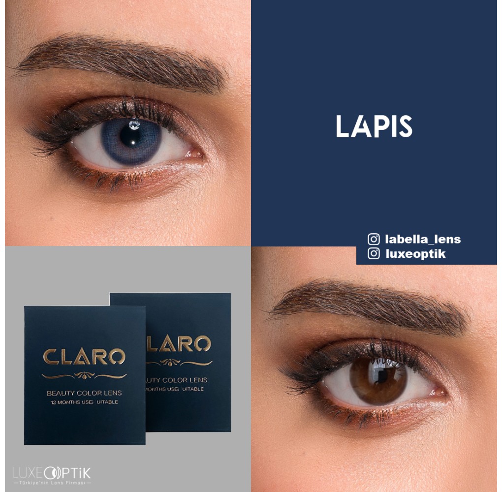 Claro Mavi Renk Safir Lapis (1 Yıllık) Numaralı & Numarasız renkli lens zarif hatları sayesinde gözleriniz için doğal bir görünüm elde etmenizi sağlayacaktır. Yumuşak renkli lensler grubundadır. Dış çeperindeki koyu mavi detayları ile hare izlenimi verip içe doğru açılarak maviliği ile güzelliği sunacaktır.