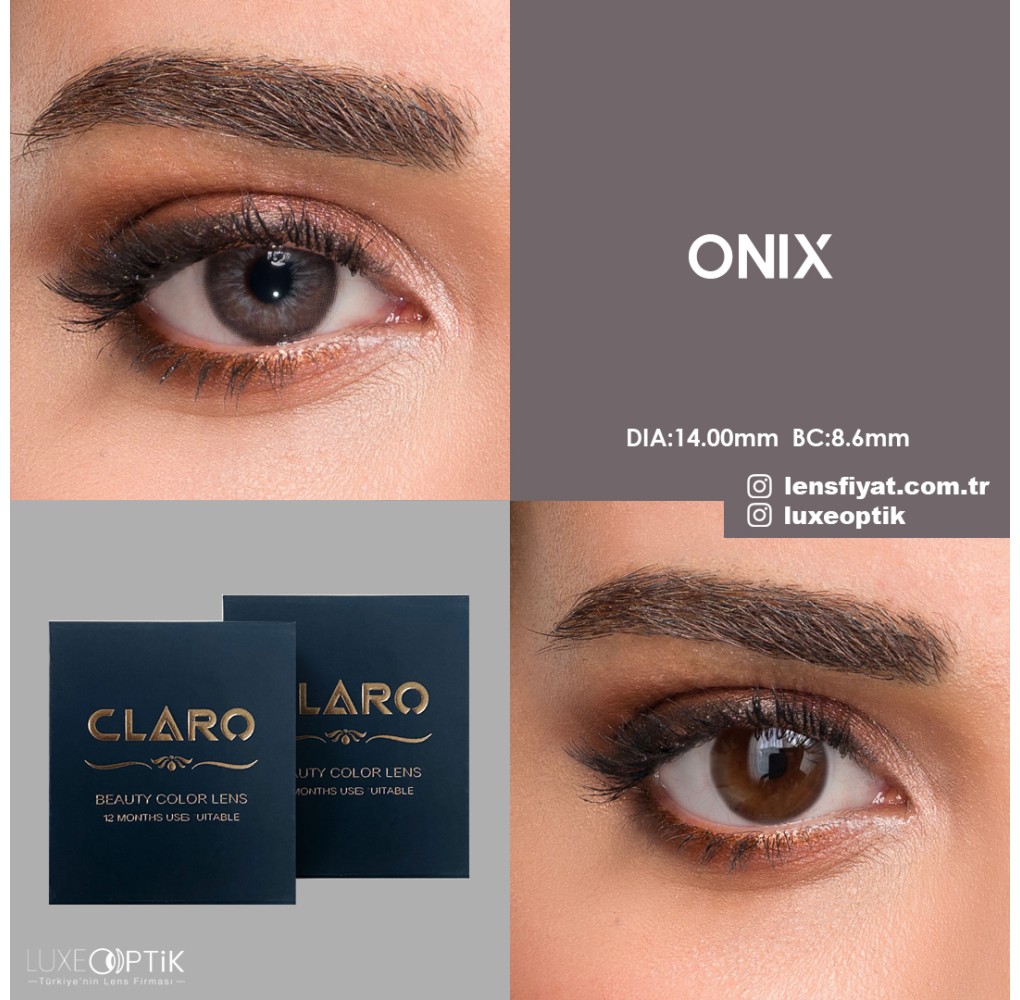 Lens tipi olarak renkli yumuşak kontakt lens olarak tanımlanmaktadır. 1 kutuda 2 adet olarak gönderilir. Su içeriği % 38 seviyelerindedir. BASE CURVE(BC) 8,6 DİA(MM) 14,00 olarak bilinir. Claro Gri Renk Onix (1 Yıllık) renkli lens grubunda olduğu için eşsiz bir renk ile sunulur.