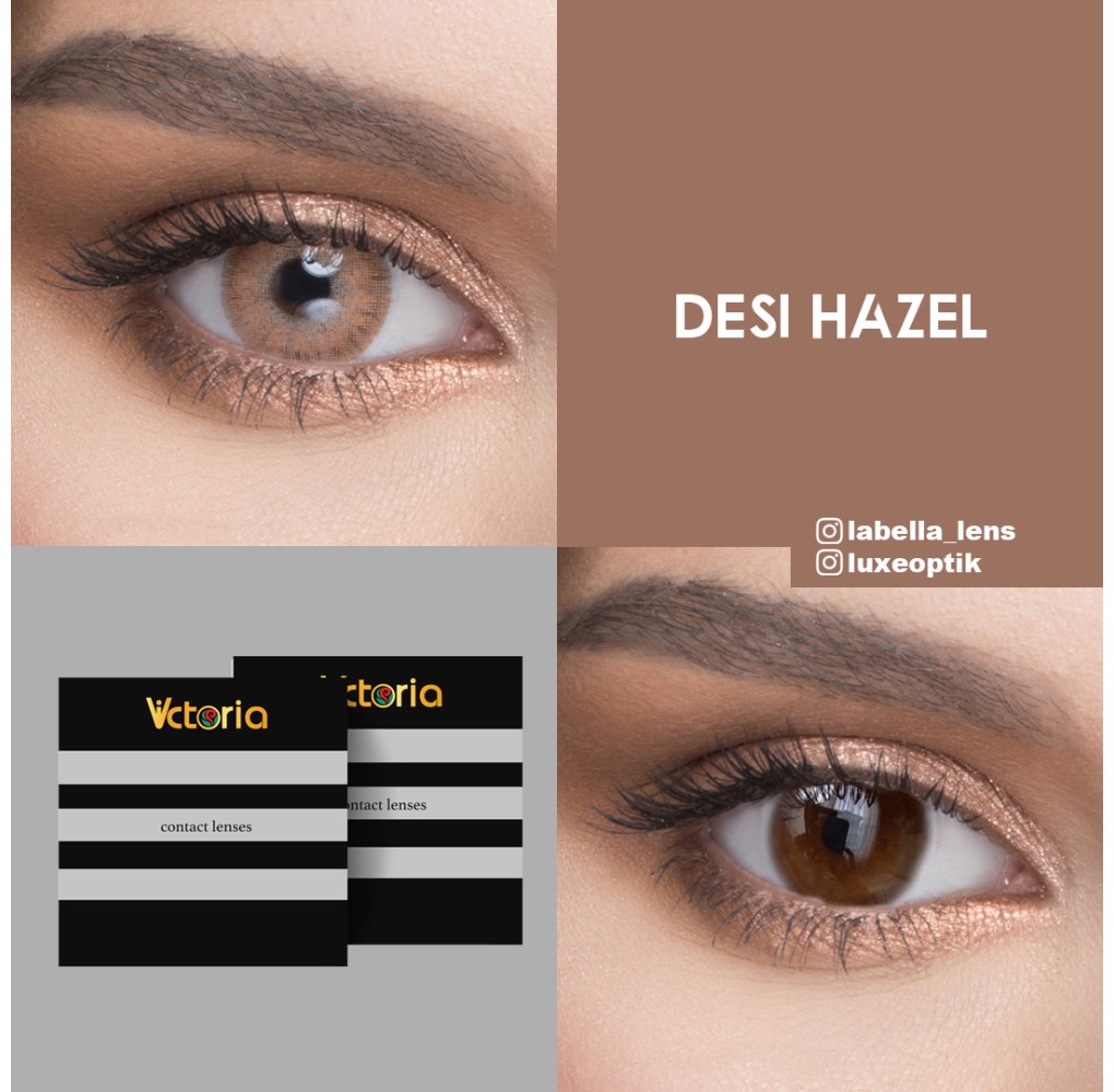 Victoria Desi Hazel Ela Renk (6 Aylık) Numaralı ve numarasız olarak üretim gerçekleştirerek, tüm lens kullanıcılarına hitap etmektedir. Modellerinde standart ölçülere bağlı kalmayarak, daha büyük, dikkat çekici gözlere sahip olmak isteyenler için, yumuşak kategoride bulunan lens modellerinin çap(DIA) ve Temel Eğri(BC) oranlarını standartlara göre daha yüksek tutmaktadır. Serinin ana özelliği gözlerinizi daha büyük ve daha parlak göstermektir. Böylelikle daha dikkat çekici ve masumane bir bakış kazandırmayı hedeflemektedir. Seçtiğiniz model dış çeperinde çok hafif çizgisel hatlı hareli bir görünüm ile içe doğru ela rengi hafif sarıya kayan tonlarda yansıtmaktadır.